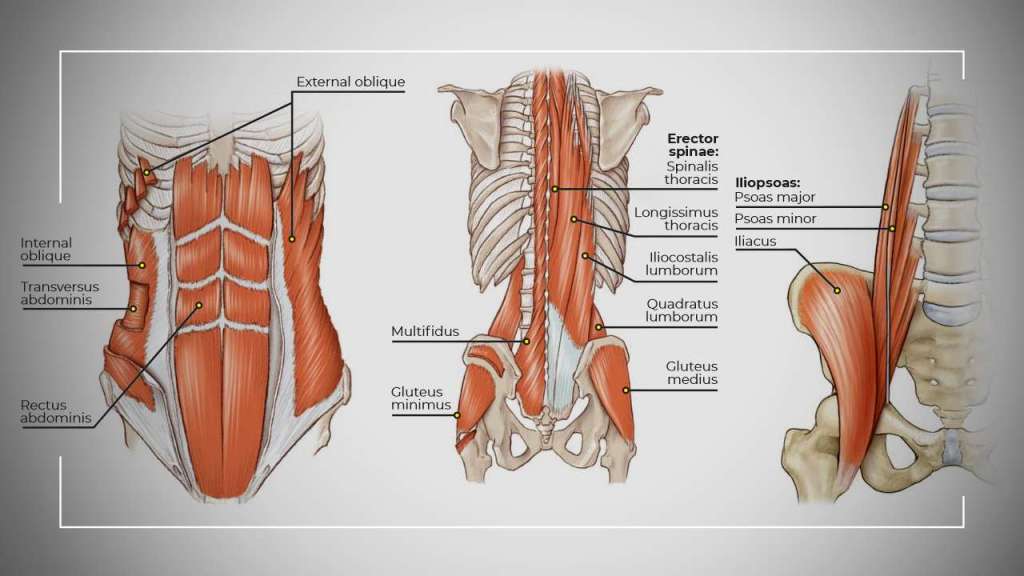 The basis of strength, stability, explosive power, and almost anything you can think of related to fitness is built upon a functional core. Without it, we are much more susceptible to injury, loss of power, and working at a much lower capacity than we could be capable of. There’s tons of different images or descriptions about what makes up the “core”, but I personally like the larger group of muscles like this one that also includes the muscles in your spine, hip flexors and glutes – because when you hear, “brace your core” it don’t just mean squeeze your abs (rectus abdominis). To be braced means fully engaged muscles all around the trunk with active glutes generating spinal stability from top to bottom. Here’s a quick image of what your “core” consists of: