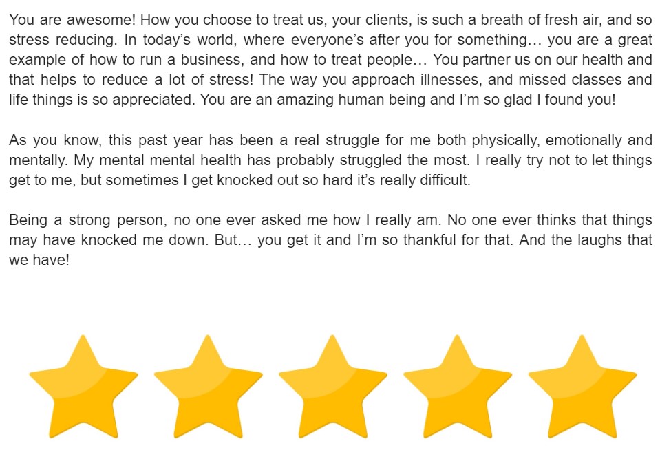 As I’ve grown as a trainer my ideas of what a healthy lifestyle look like have changed a LOT. In my early 20’s it was about being as jacked as possible, always on the grind, “I’ll sleep when I’m dead” mentality – which I soon learned is not sustainable, enjoyable, or healthy. Now in my mid 30’s, it’s about balance and stress management. Good stress makes us strong, bad stress makes us weak, and a lot of us self-inflict too much of the bad kind. My goal is to teach through example to increase our good stressors (challenging exercise, eating healthier foods, fostering discipline and constant learning) and decrease the bad ones (overworking, burning out, and lack of self-awareness).